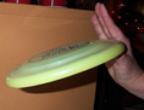 draai de schijf in rondjes om de vinger heen en laat op zeker moment de schijf van de vinger afschieten. Let op dat u weet welke richting de schijf zal opvliegen, dus laat op het juiste moment los (vergt enige oefening om de locatie te bepalen)