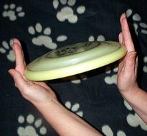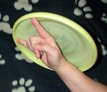 Pak de schijf vast als op bovenstaande foto. Breng nu de schijf naar de pols met de bolle kant van de frisbee bovenop. Nu maakt u de beweging alsof je dobbelstenen hard op de grond gooit en maakt daarbij tevens een opwaartse beweging met de hand. De schijf “wappert” nu om zijn as naar voren.